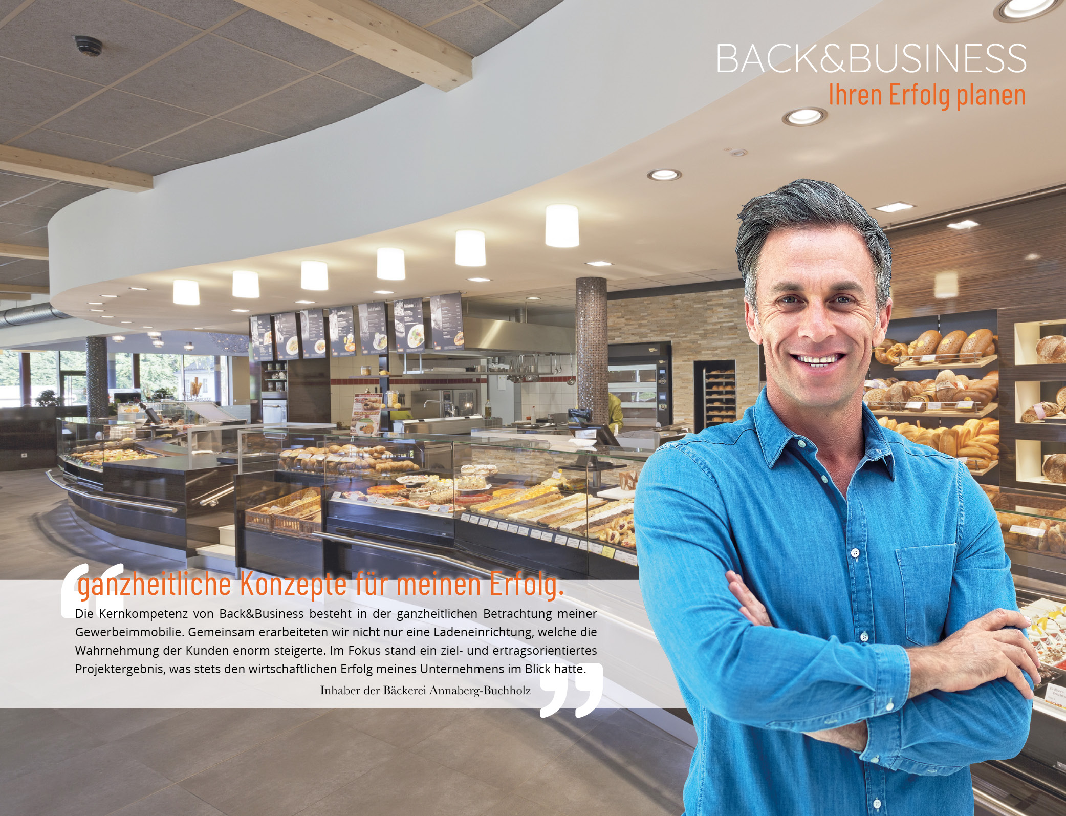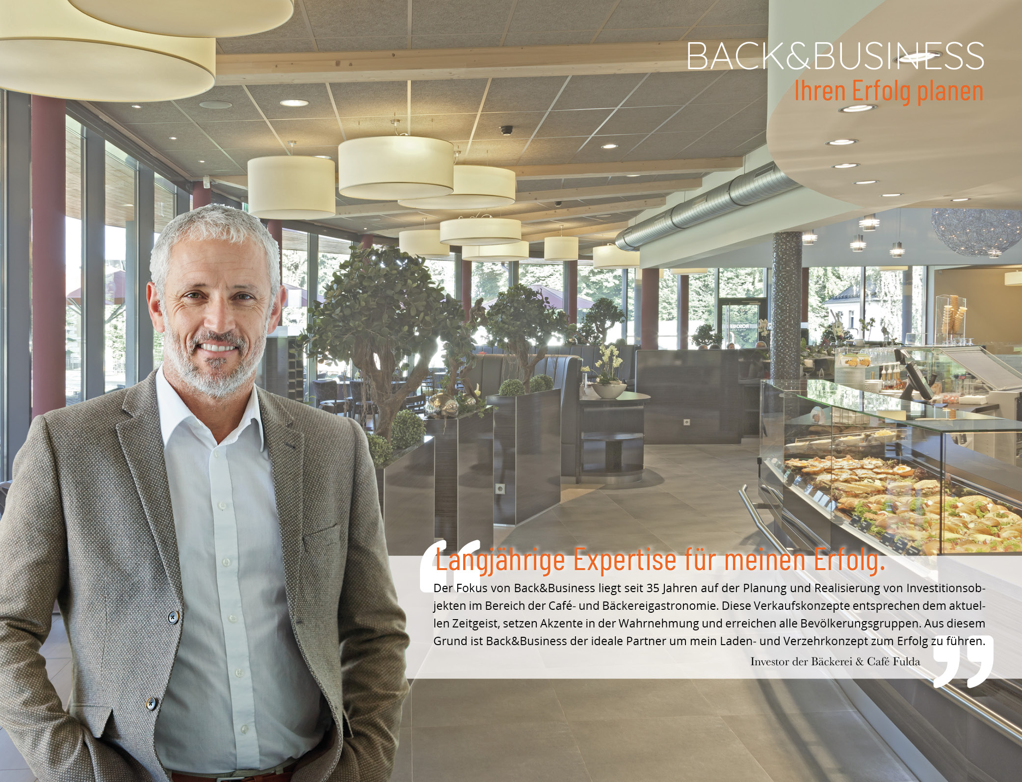 Der Fokus von BACK&BUSINESS liegt seit 35 Jahren auf der Planung und Realisierung von Investitionsobjekten im Bereich der Café- und Bäckereigastronomie. Diese Verkaufskonzepte entsprechen dem aktuellen Zeitgeist, setzen Akzente in der Wahrnehmung und erreichen alle Bevölkerungsgruppen.
